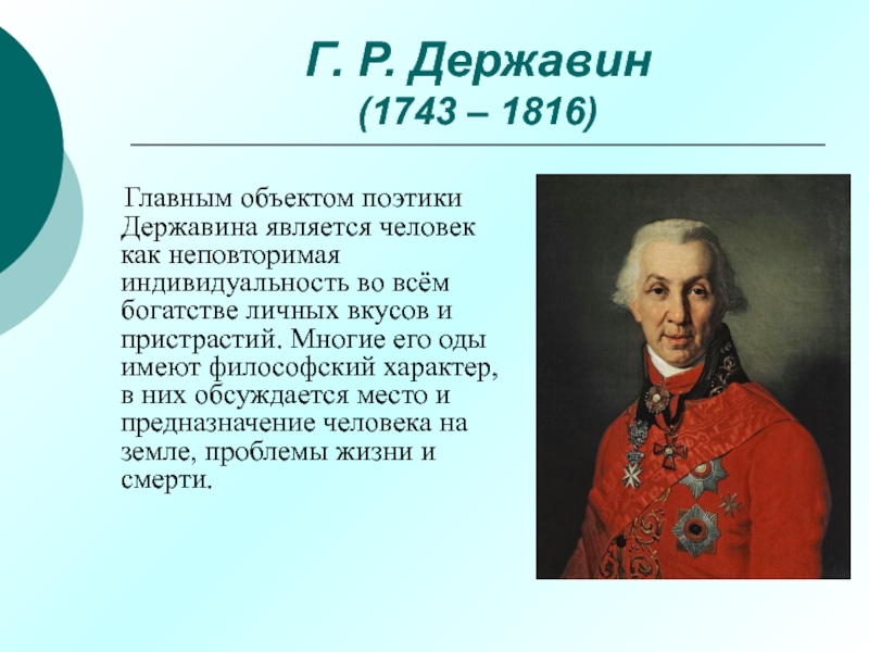 Державина является человек как неповторимая индивидуальность во всём богатстве личных