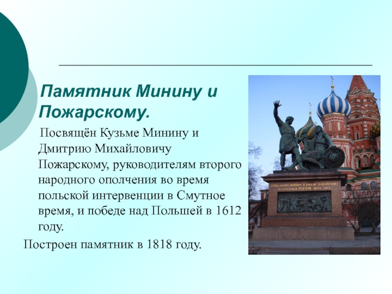 Посвящён Кузьме Минину и Дмитрию Михайловичу Пожарскому, руководителям второго народного