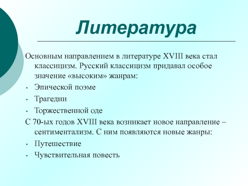 Основным направлением в литературе XVIII века стал классицизм. Русский классицизм
