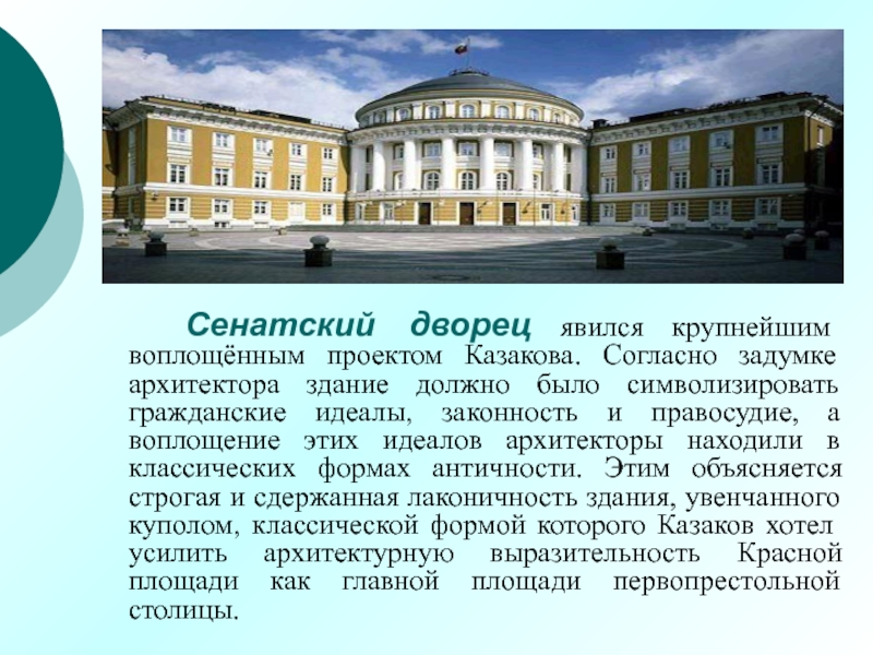 Слайд 17 Сенатский дворец явился крупнейшим воплощённым проектом Казакова. Согласно