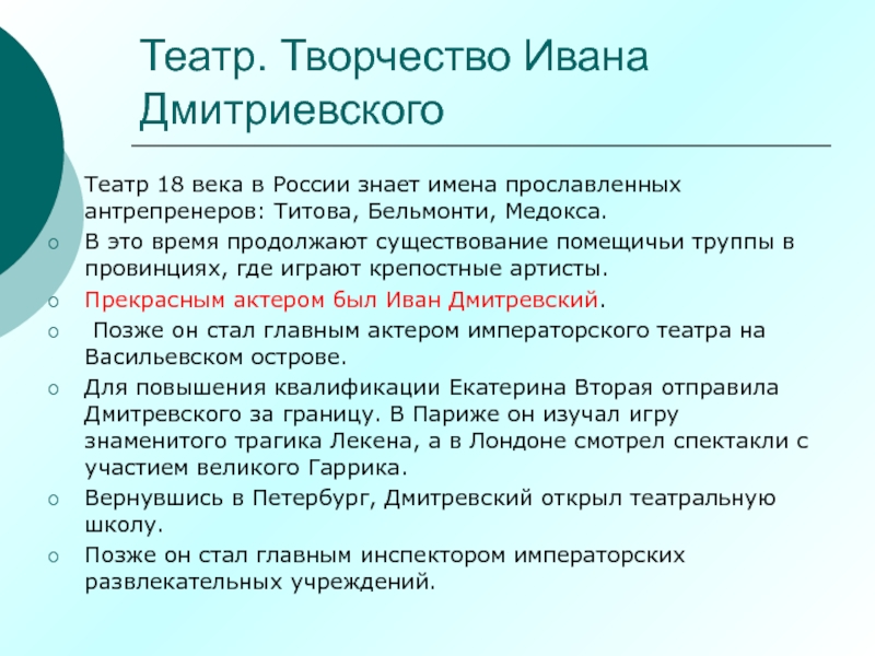 Слайд 53Театр. Творчество Ивана Дмитриевского