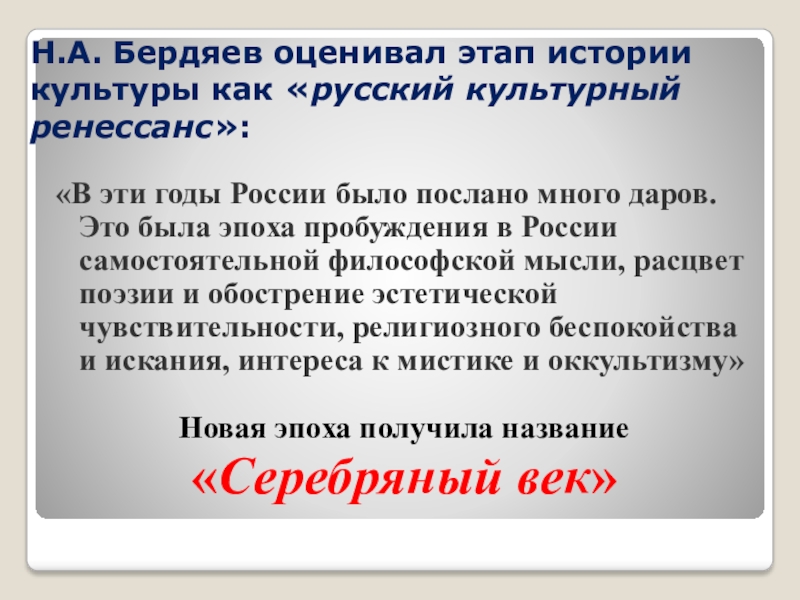 Слайд 5Н.А. Бердяев оценивал этап истории культуры как «русский культурный ренессанс»: