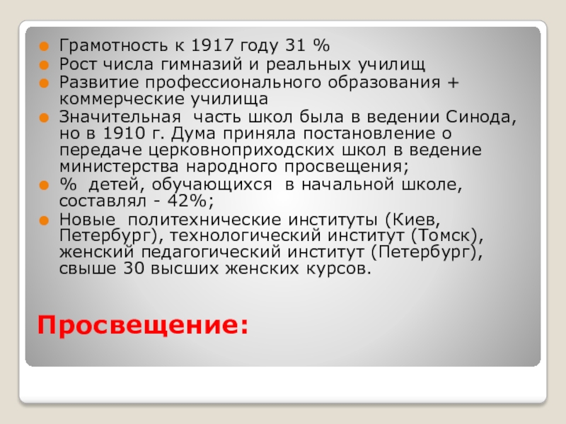 Новые политехнические институты (Киев, Петербург), технологический институт (Томск), женский педагогический институт (Петербург), свыше 30 высших женских курсов.