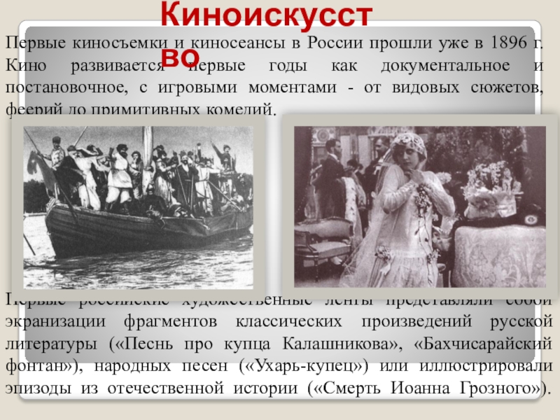 Первые российские художественные ленты представляли собой экранизации фрагментов классических произведений русской литературы («Песнь про купца Калашникова», «Бахчисарайский фонтан»), народных песен («Ухарь-купец») или иллюстрировали эпизоды из отечественной истории («Смерть Иоанна Грозного»).