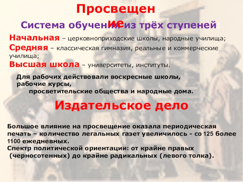 Для рабочих действовали воскресные школы, рабочие курсы,