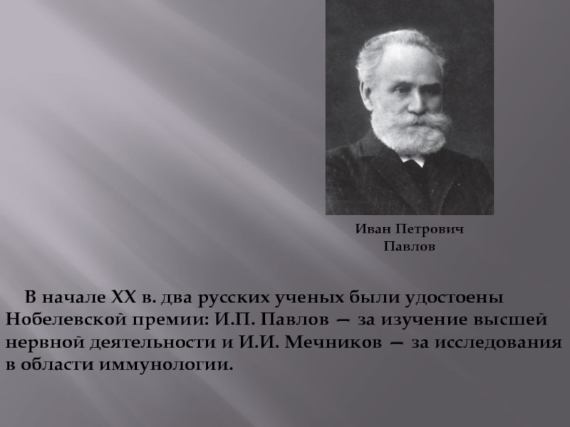 изучение высшей нервной деятельности и И.И. Мечников — за исследования в области иммунологии.