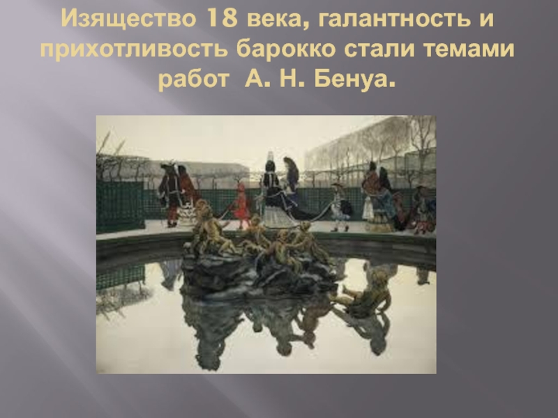 Слайд 21Изящество 18 века, галантность и прихотливость барокко стали темами работ