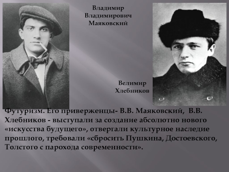 Футуризм. Его приверженцы- В.В. Маяковский, В.В. Хлебников - выступали