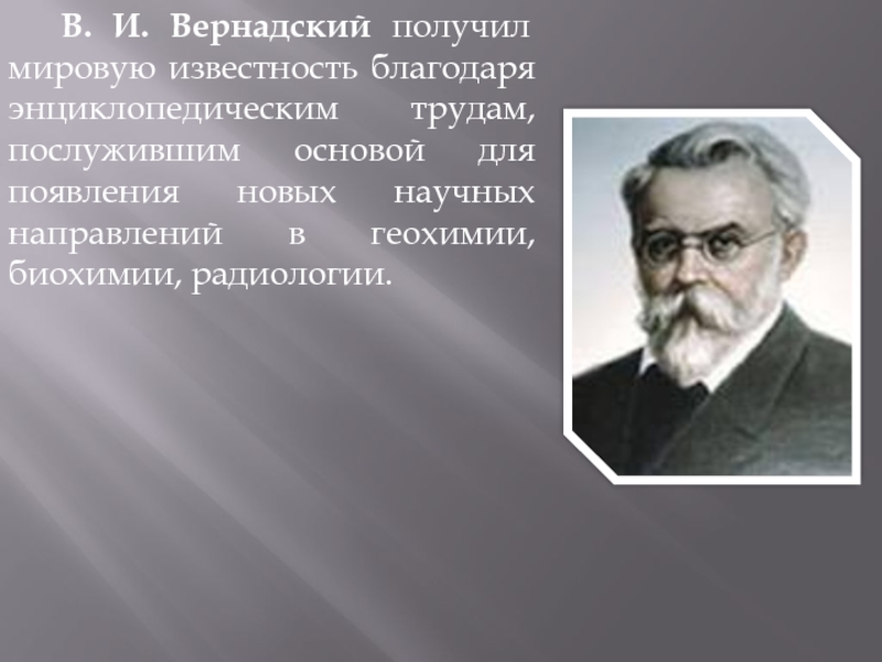 Слайд 5В. И. Вернадский получил мировую известность благодаря энциклопедическим трудам, послужившим