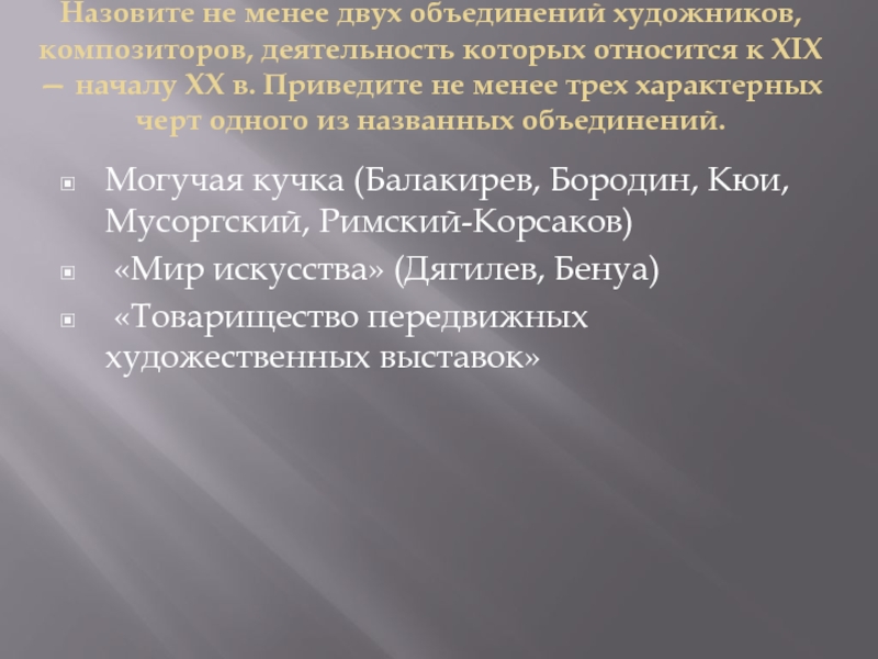 Слайд 17Назовите не менее двух объединений художников, композиторов, деятельность которых относится