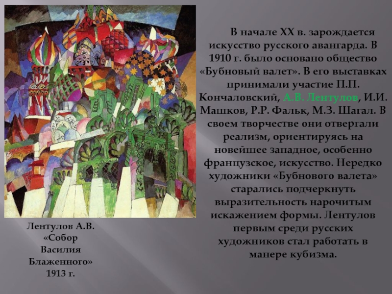 «Бубновый валет». В его выставках принимали участие П.П. Кончаловский, А.В. Лентулов, И.И. Машков, Р.Р. Фальк, М.З. Шагал. В своем творчестве они отвергали реализм, ориентируясь на новейшее западное, особенно французское, искусство. Нередко художники «Бубнового валета» старались подчеркнуть выразительность нарочитым искажением формы. Лентулов первым среди русских художников стал работать в манере кубизма.