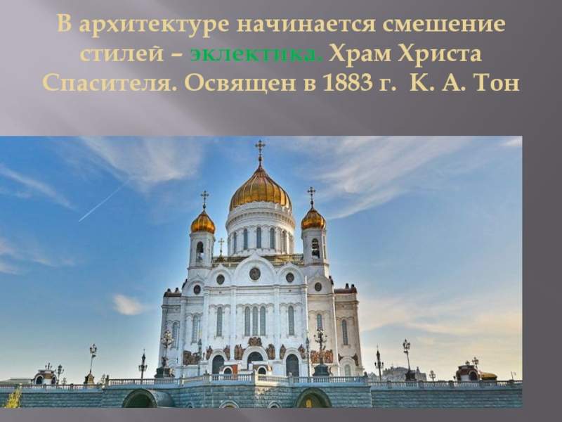 Слайд 29В архитектуре начинается смешение стилей – эклектика. Храм Христа Спасителя.
