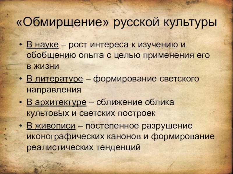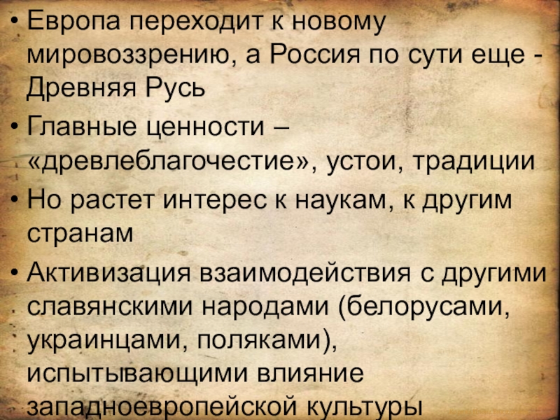 интерес к наукам, к другим странамАктивизация взаимодействия с другими славянскими народами (белорусами, украинцами, поляками), испытывающими влияние западноевропейской культуры