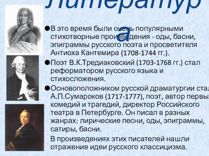 басни, эпиграммы русского поэта и просветителя Антиоха Кантемира (1708-1744 гг.).