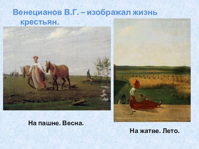 Слайд 17Венецианов В.Г. – изображал жизнь крестьян.