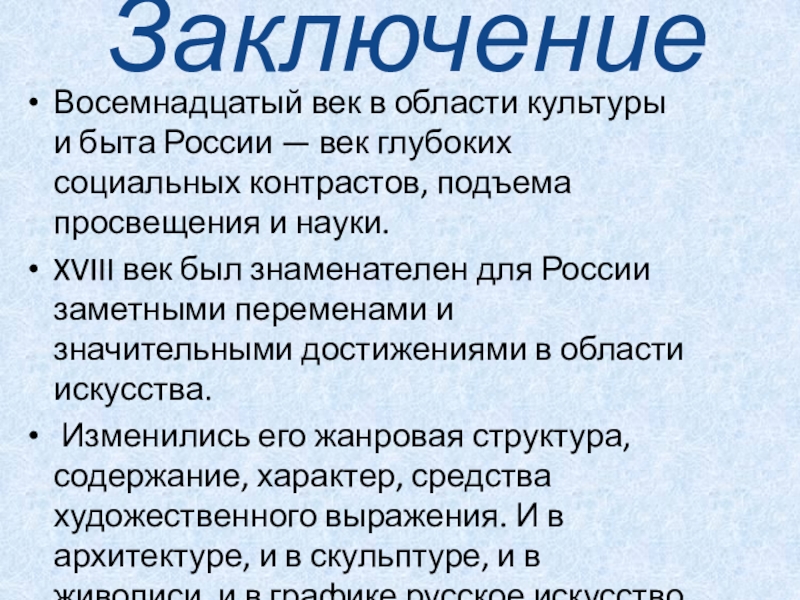 Изменились его жанровая структура, содержание, характер, средства художественного выражения. И в архитектуре, и в скульптуре, и в живописи, и в графике русское искусство выходило на общеевропейские пути развития.