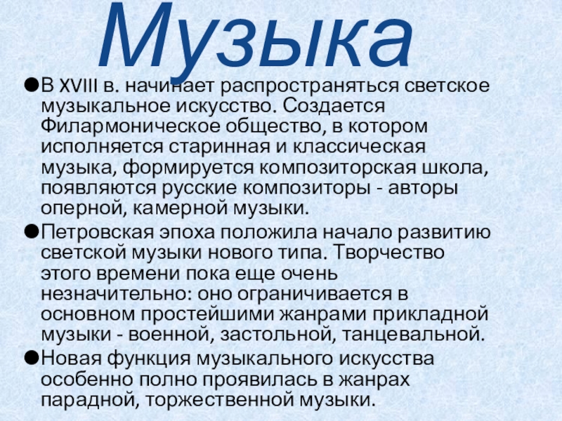 Петровская эпоха положила начало развитию светской музыки нового типа. Творчество этого времени пока еще очень незначительно: оно ограничивается в основном простейшими жанрами прикладной музыки - военной, застольной, танцевальной.