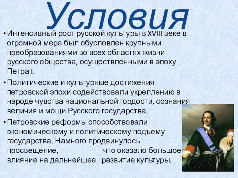Петровские реформы способствовали экономическому и политическому подъему государства. Намного продвинулось просвещение, что оказало большое влияние на дальнейшее развитие культуры.