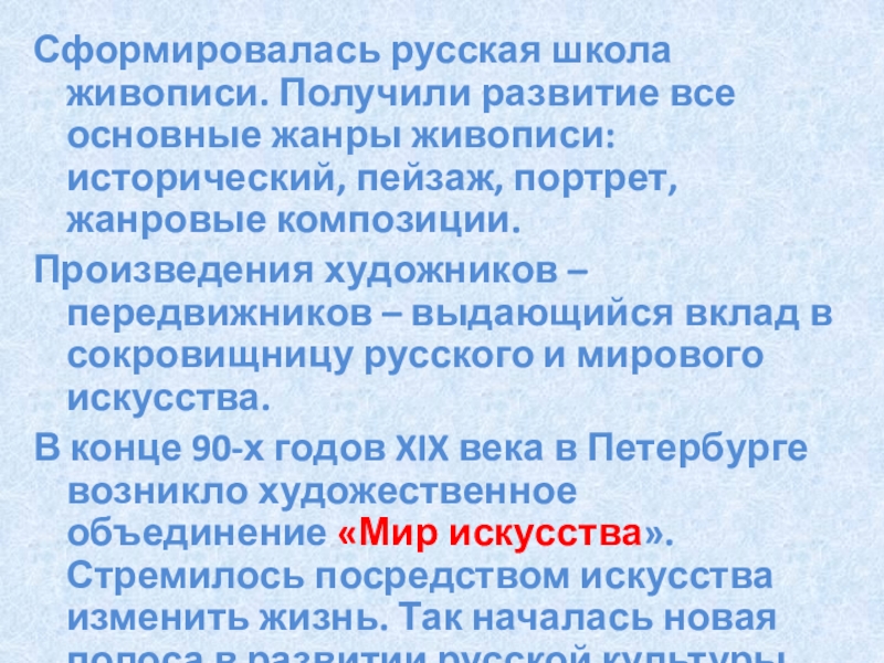 Слайд 29Сформировалась русская школа живописи. Получили развитие все основные жанры живописи: