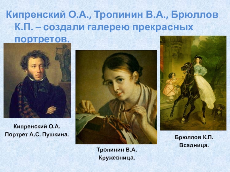 Слайд 14Кипренский О.А., Тропинин В.А., Брюллов К.П. – создали галерею прекрасных