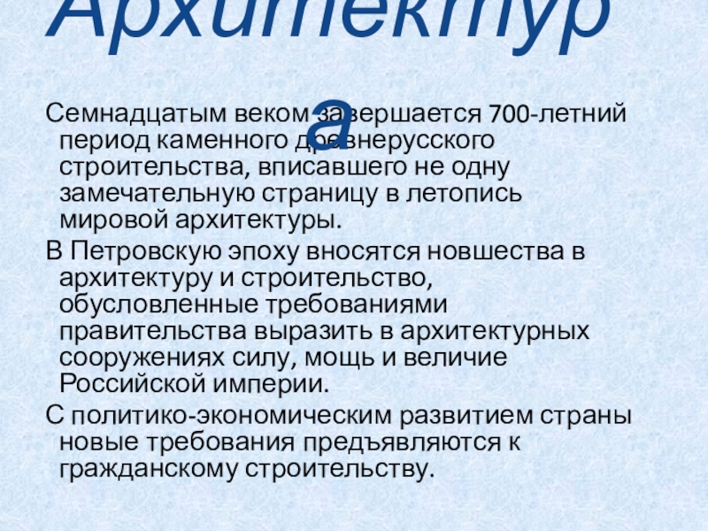 Слайд 9Семнадцатым веком завершается 700-летний период каменного древнерусского строительства, вписавшего не