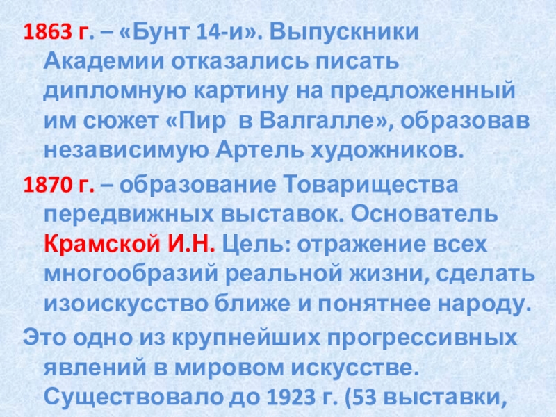 1870 г. – образование Товарищества передвижных выставок. Основатель Крамской И.Н. Цель: отражение всех многообразий реальной жизни, сделать изоискусство ближе и понятнее народу.