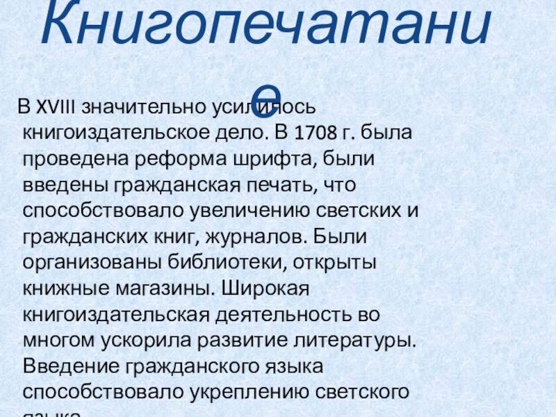 Слайд 5В XVIII значительно усилилось книгоиздательское дело. В 1708 г. была