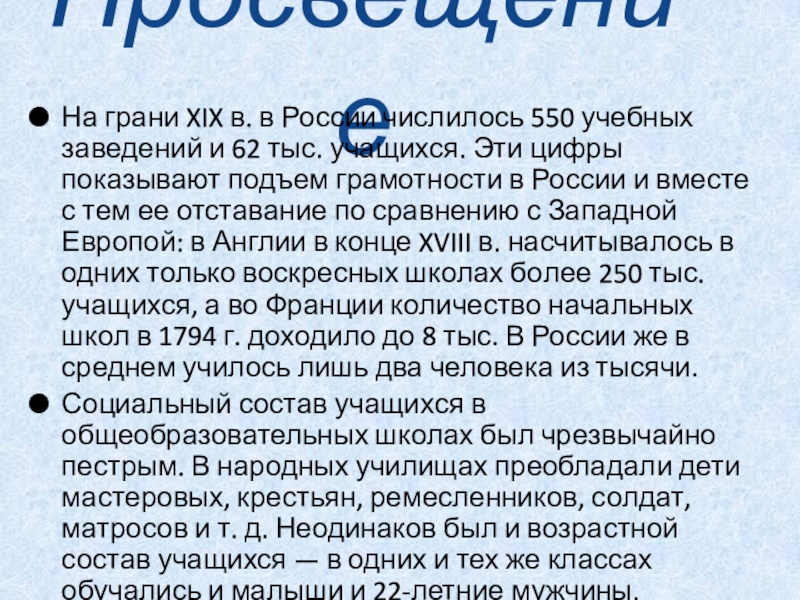 России и вместе с тем ее отставание по сравнению с Западной Европой: в Англии в конце XVIII в. насчитывалось в одних только воскресных школах более 250 тыс. учащихся, а во Франции количество начальных школ в 1794 г. доходило до 8 тыс. В России же в среднем училось лишь два человека из тысячи.