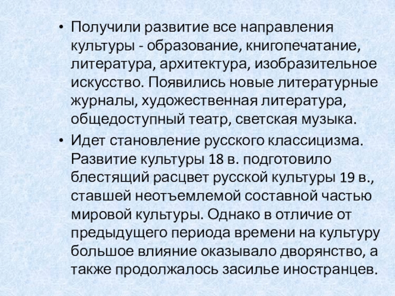 Идет становление русского классицизма. Развитие культуры 18 в. подготовило блестящий расцвет русской культуры 19 в., ставшей неотъемлемой составной частью мировой культуры. Однако в отличие от предыдущего периода времени на культуру большое влияние оказывало дворянство, а также продолжалось засилье иностранцев.