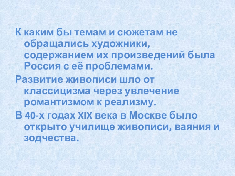 В 40-х годах XIX века в Москве было открыто училище живописи, ваяния и зодчества.