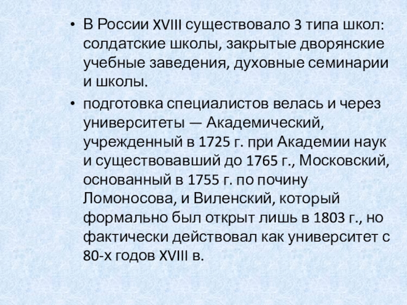через университеты — Академический, учрежденный в 1725 г. при Академии наук и существовавший до 1765 г., Московский, основанный в 1755 г. по почину Ломоносова, и Виленский, который формально был открыт лишь в 1803 г., но фактически действовал как университет с 80-х годов XVIII в.