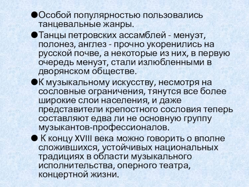 них, в первую очередь менуэт, стали излюбленными в дворянском обществе.