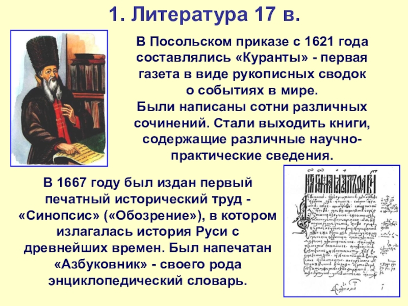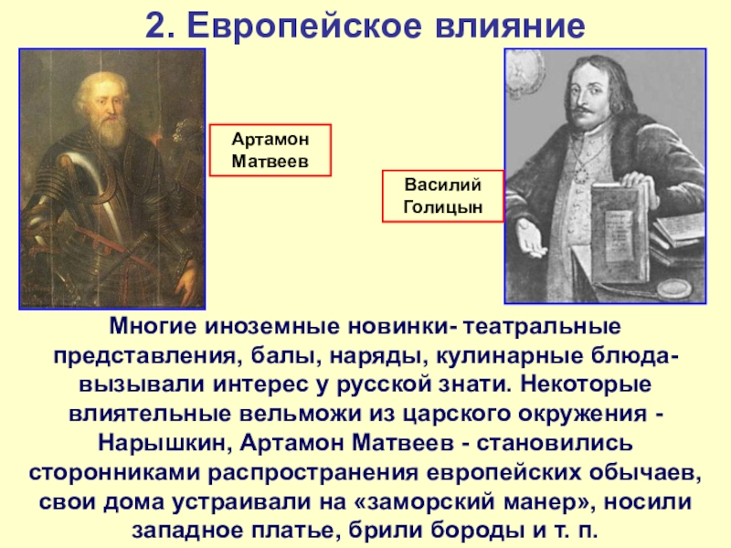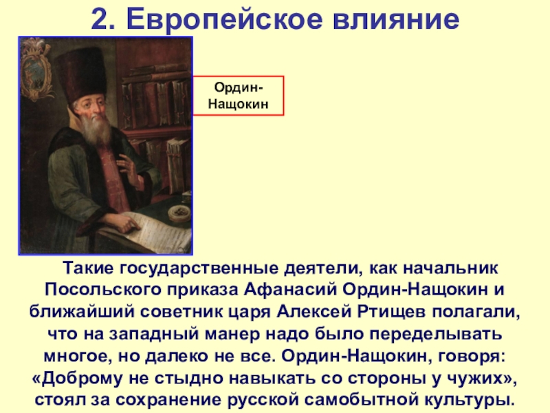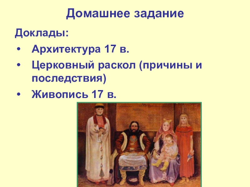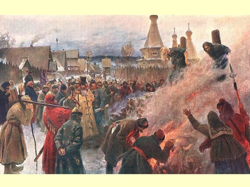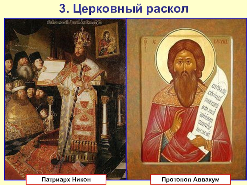 в священных книгах, иконы написанные не по канону – уничтожить, заменить двуперстное крещение на трехперстное, изменить поклоны в церквях, ввести более строгие запреты для священнослужителей. Большинство церковников категорически отказались принять нововведения, начался церковный раскол (старообрядцы), их идейным вождем стал протопоп Аввакум. Начались преследования, староверы уходили в леса, сжигали себя (гари), бунтовали.