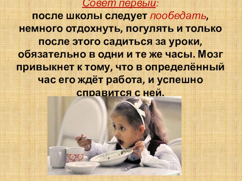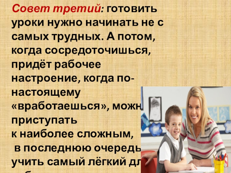 Слайд 5Совет третий: готовить уроки нужно начинать не с самых трудных. А