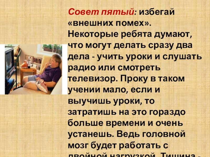 Слайд 7Совет пятый: избегай «внешних помех». Некоторые ребята думают, что могут делать