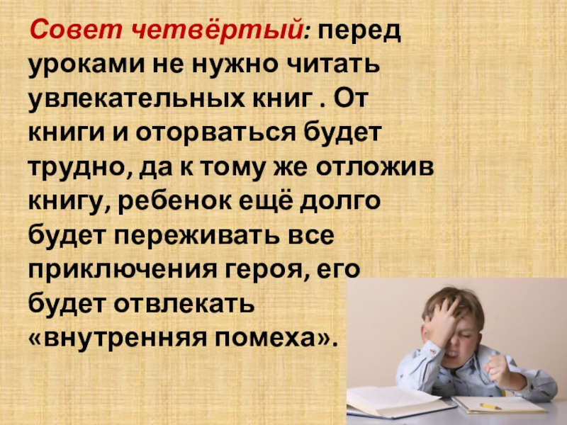 Слайд 6Совет четвёртый: перед уроками не нужно читать увлекательных книг . От