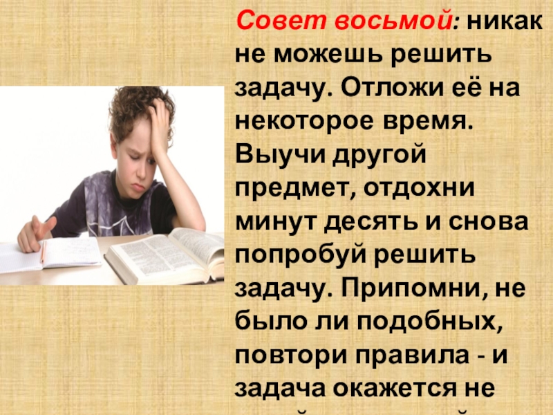 Слайд 10Совет восьмой: никак не можешь решить задачу. Отложи её на некоторое
