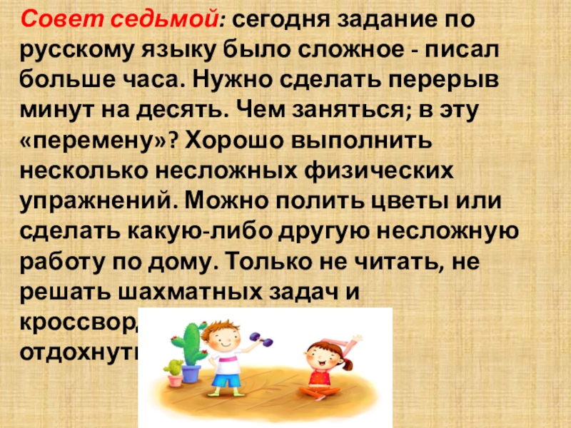 Слайд 9Совет седьмой: сегодня задание по русскому языку было сложное - писал