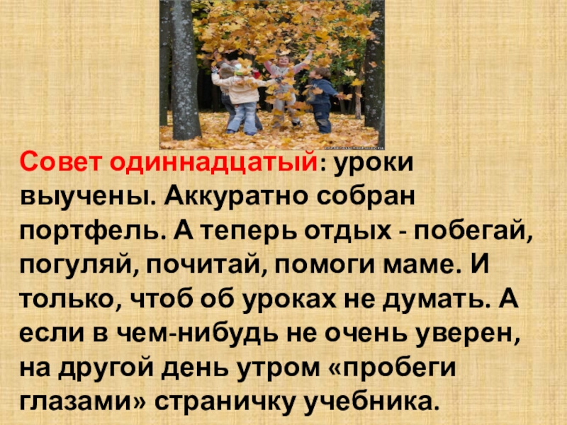 Слайд 13Совет одиннадцатый: уроки выучены. Аккуратно собран портфель. А теперь отдых