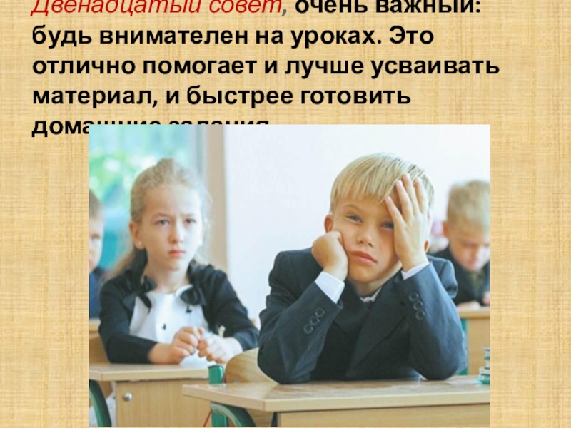 Слайд 14Двенадцатый совет, очень важный: будь внимателен на уроках. Это отлично