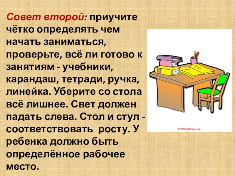 Слайд 4Совет второй: приучите чётко определять чем начать заниматься, проверьте, всё ли