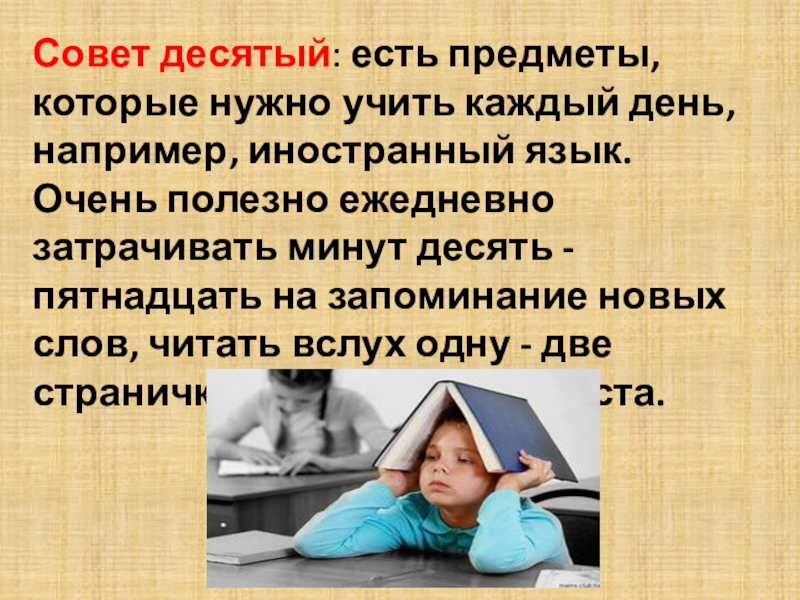 Слайд 12Совет десятый: есть предметы, которые нужно учить каждый день, например,