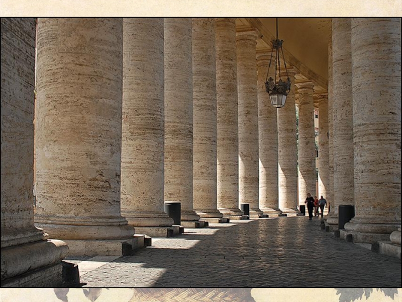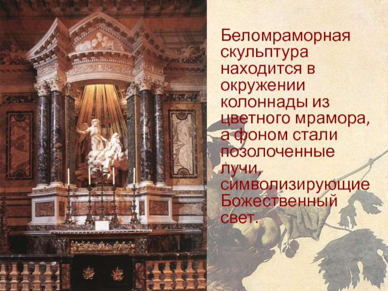 Слайд 42Беломраморная скульптура находится в окружении колоннады из цветного мрамора, а