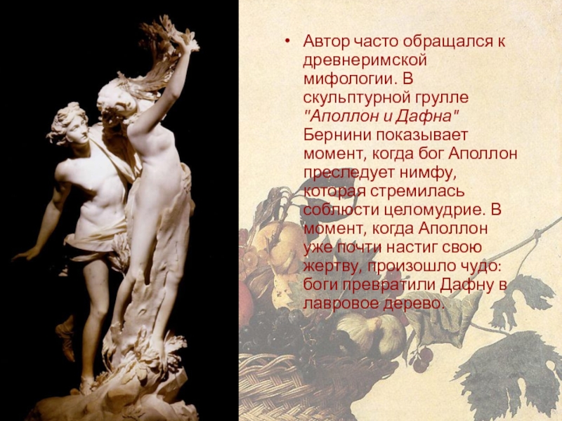 Слайд 40Автор часто обращался к древнеримской мифологии. В скульптурной грулле "Аполлон