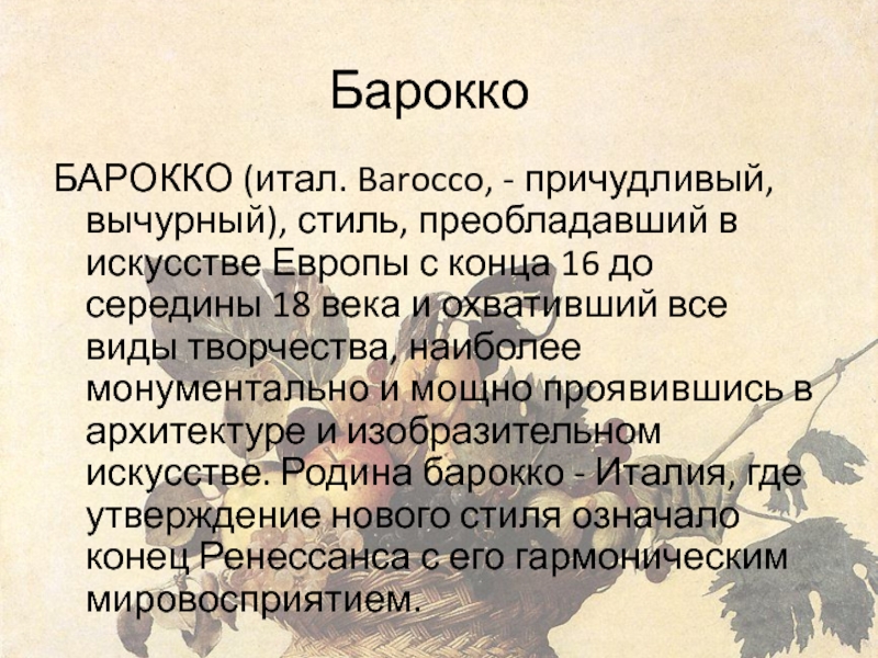 БАРОККО (итал. Barocco, - причудливый, вычурный), стиль, преобладавший в искусстве