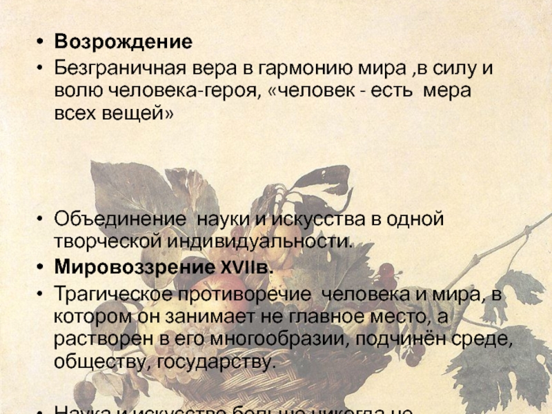 Трагическое противоречие человека и мира, в котором он занимает не главное место, а растворен в его многообразии, подчинён среде, обществу, государству.