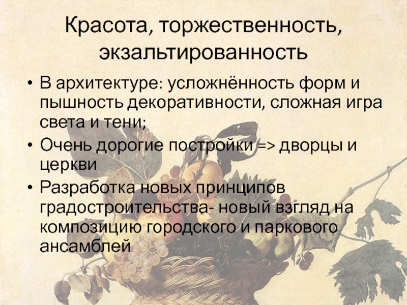 В архитектуре: усложнённость форм и пышность декоративности, сложная