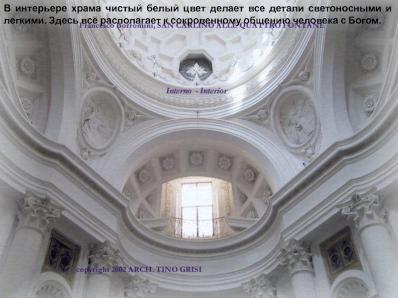 Слайд 27В интерьере храма чистый белый цвет делает все детали светоносными