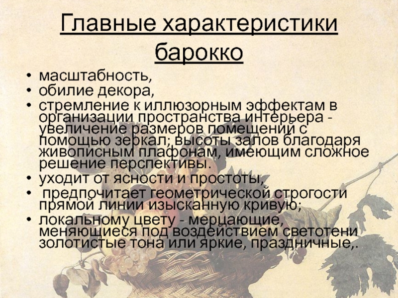 изобилие скульптуры на фасадах и в интерьерах, волюты, лучковые фасады, колонны и пилястры.