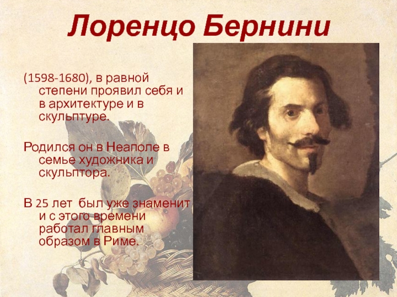 В 25 лет был уже знаменит и с этого времени работал главным образом в Риме.